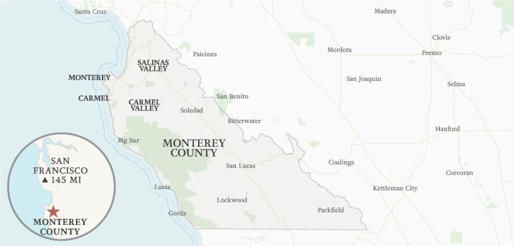 Monterey County, also with its cool coastal influence, has been producing wines in the area for over 250 years. Here are a couple of larger growing areas in the county: